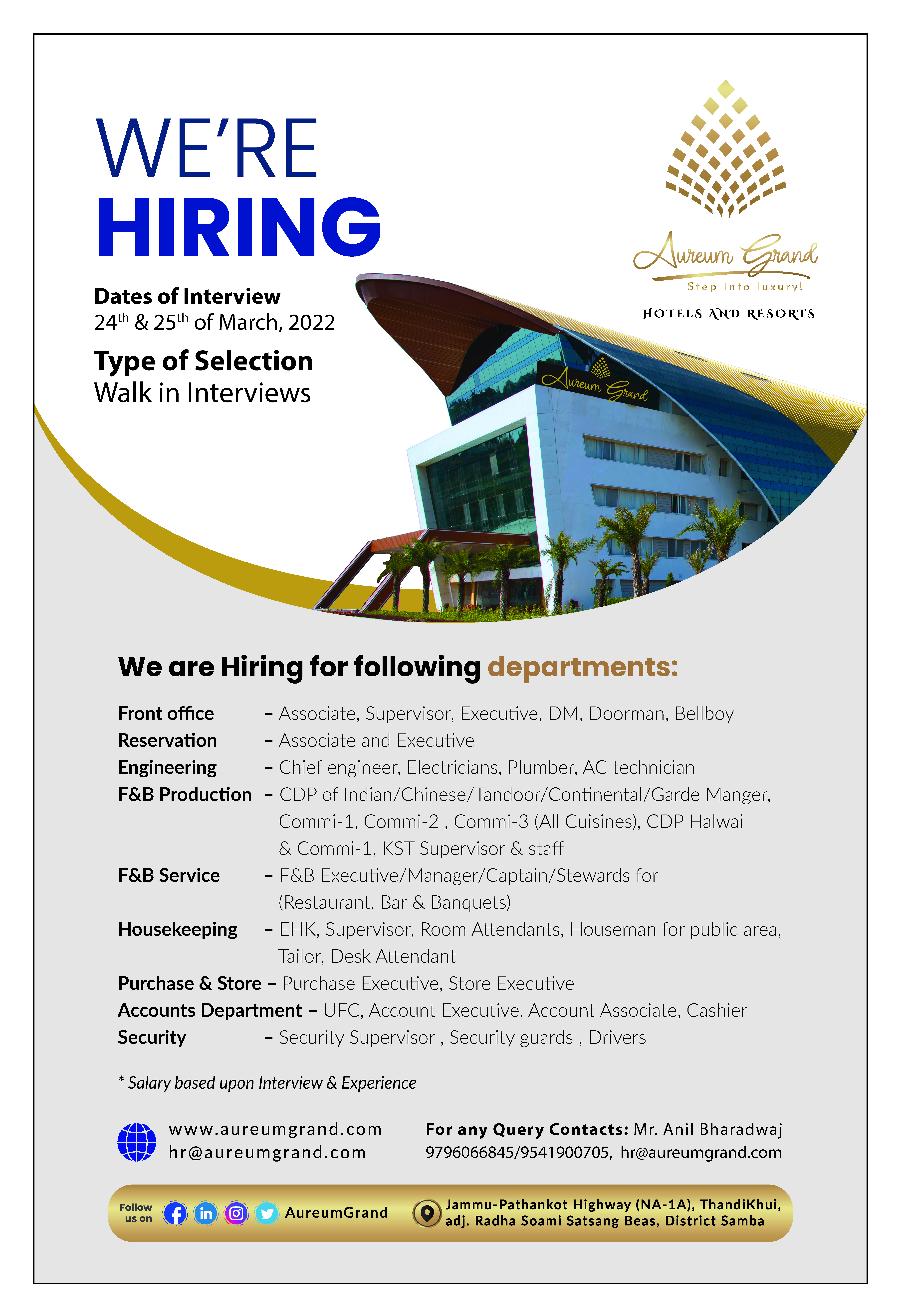 Aureum Grand is a newly launched luxury 5-star hotel located in the heart of Jammu, designed to offer an elegant blend of modern comfort and timeless hospitality. With premium amenities and world-class service, Aureum Grand aims to redefine the luxury stay experience in the region.